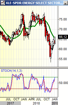 We discuss XLE in the Sector Review, so we will take just a little more space here. XLE is in one of the weaker relative sectors this year, but it is on a monthly buy recycle, and daily and weekly stochastics are overbought. The chart pattern is similar to USO, discussed in the “commodities” section, below. Resistance is from 67.50 to 70, and support is 60 to 55. The biggest problem we have with XLE is the heavy weighting toward CVX and XOM. XOM is not trading well and this could be impacting performance.