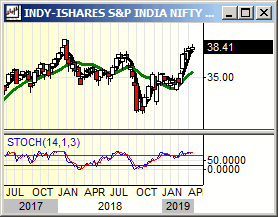 We are using INDY, a cap weighted ETF of the 50 largest companies on the Indian Stock Exchange, in our models. It is still the strongest of these ETFs. It has short-term support at 36 and intermediate support from 33 to 31. Resistance is 39 to multi-year highs. The daily and weekly stochastics are overbought, and the monthly suggests there is more to go on the upside. INDA is the second strongest of these and is weaker than INDY but not by much. It tracks a broader index – 85% of all the stocks on the Indian Exchange. It has resistance from 36 to 38 before it makes a new high. Support is in layers from 34 to 30. The daily stochastic is close to overbought and is technically in sell mode, while the weekly has become overbought – the monthly, like INDY, suggests there is further to go.