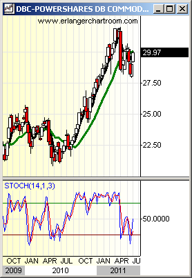 We show daily and weekly charts of the DBC below, and note that both charts have etched out bottoming configurations. From a momentum standpoint, the new lows in the June 23 – 27 timeframe satisfied the divergence bottom signal given by the FPOs after the initial drop in early May (again, see the Midweek Report of June 29, 2011). A move above the 30.60 area would complete technical bottoming patterns in these – and advisors should add commodities to their asset mix at that time if they have not done so already.